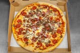 Pepperoni, sausage, mushrooms, onions, green peppers, black olives, meatballs & extra cheese.